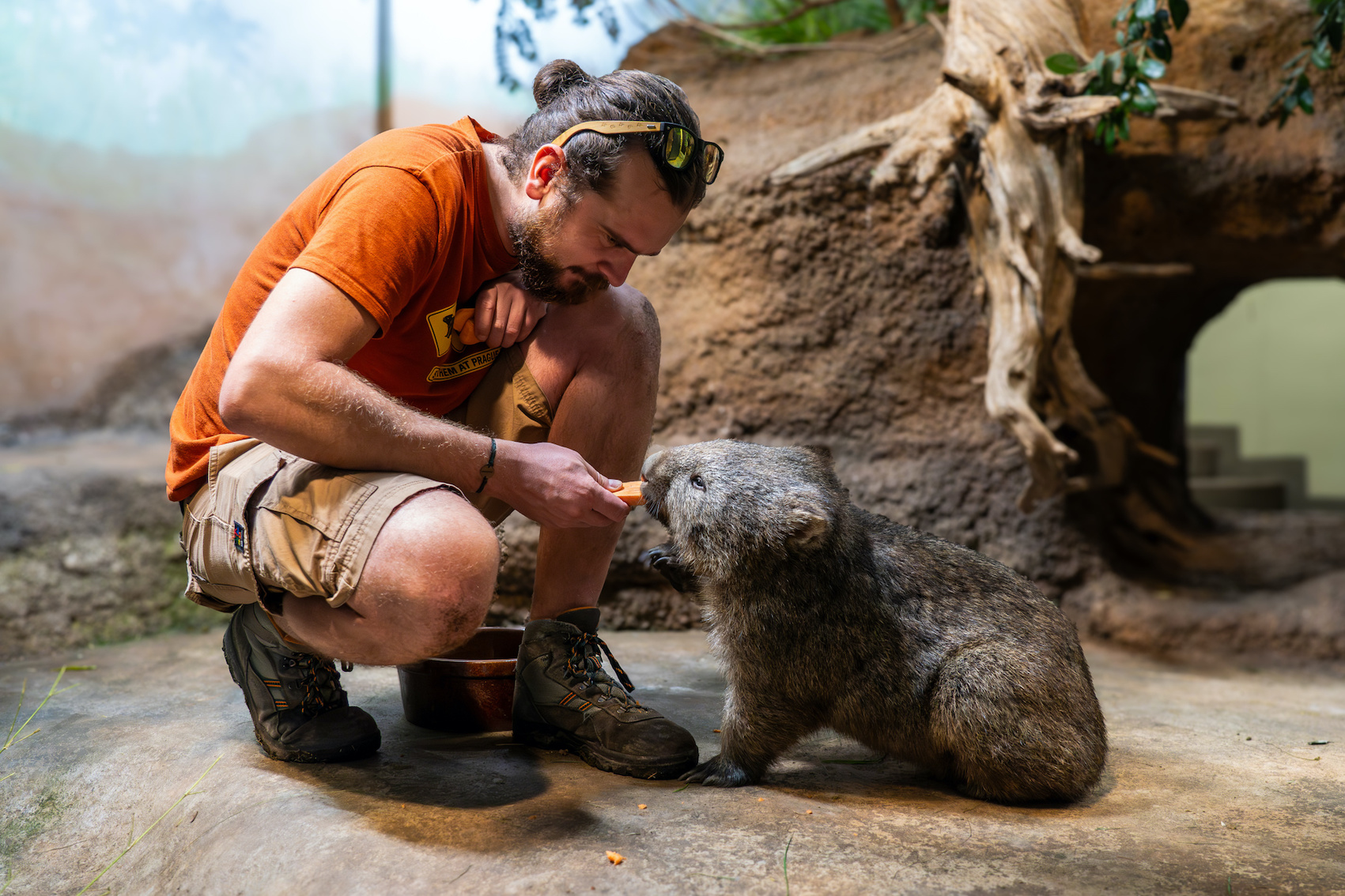 Foto 3: Chovatel vombatů David Vala si se svými svěřenci vybudoval blízký vztah založený na vzájemné důvěře. To mu usnadňuje například preventivní veterinární vyšetření. Na snímku se samcem Cooperem v expozici Darwinův kráter. Foto Oliver Le Que, Zoo Praha