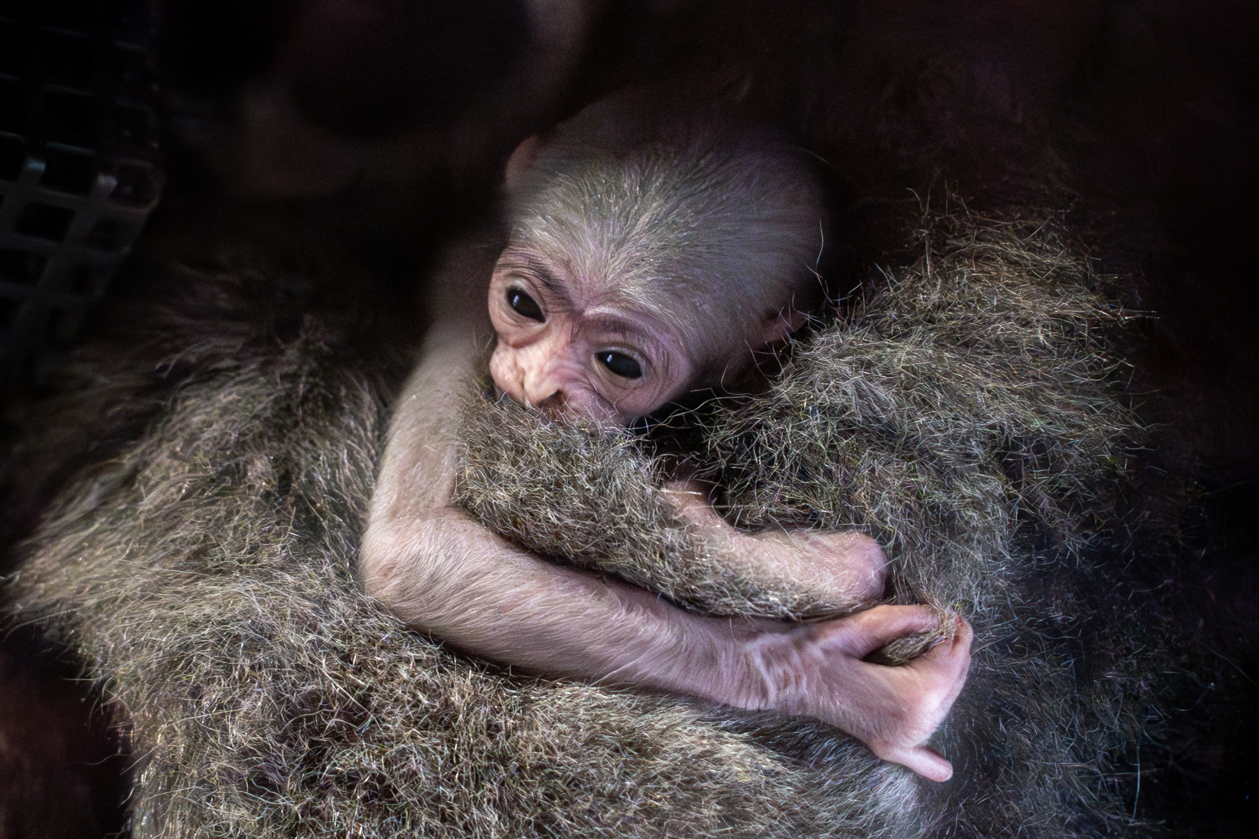 Foto: Čtyřdenní mládě gibona stříbrného na jedné z prvních dnešních fotografií. Mládě mohou návštěvníci vidět už nyní na břiše matky Alang Alang v expozici gibonů v dolní části areálu Zoo Praha. Foto Oliver Le Que, Zoo Praha